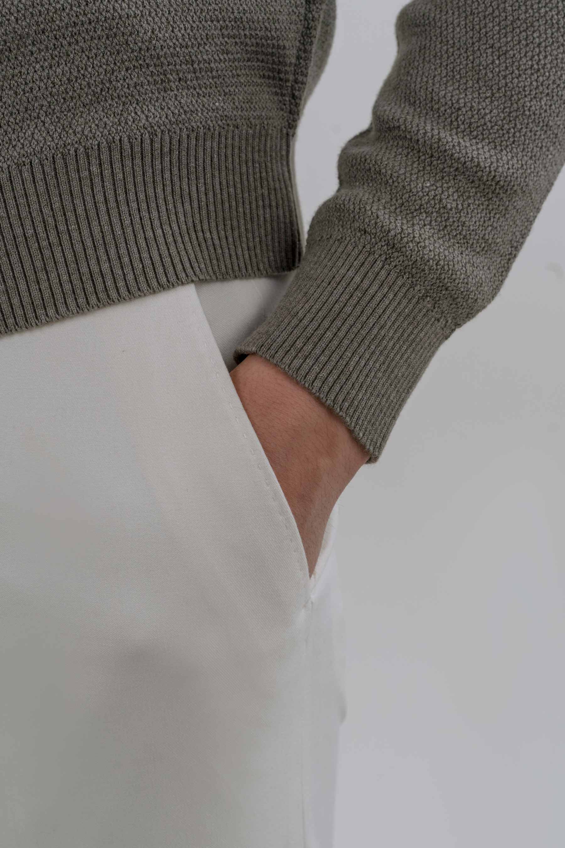 برای استایل مینیمال و ترند، این بافت رو با شلوار سفید یا کرم و کفش چرمی روشن ست کن. اگه می‌خوای استایل جدی‌تری داشته باشی، زیپ رو تا نیمه ببند و زیرش یقه‌اسکی ظریف بپوش. این مدل با پالتو یا کت اسپرت هم ترکیب جذابی می‌سازه.